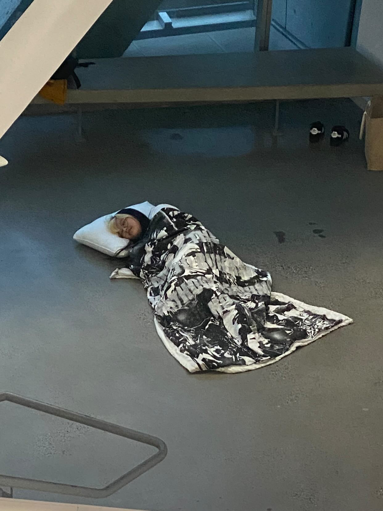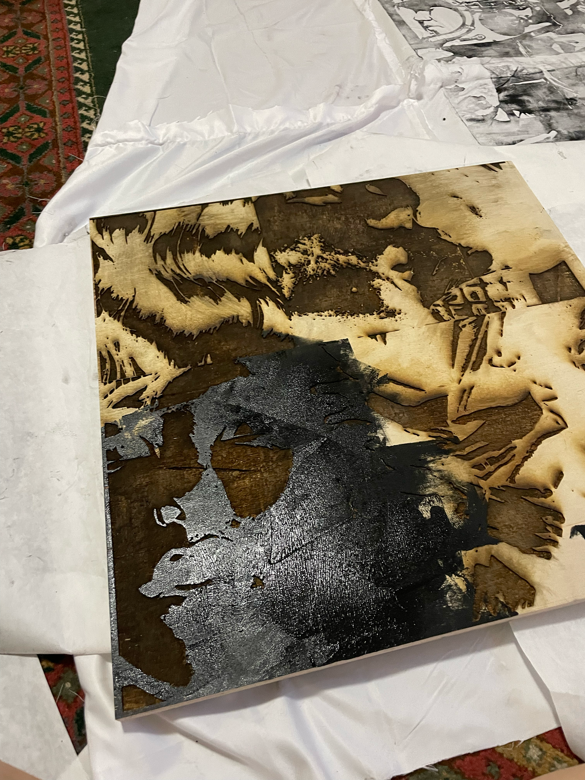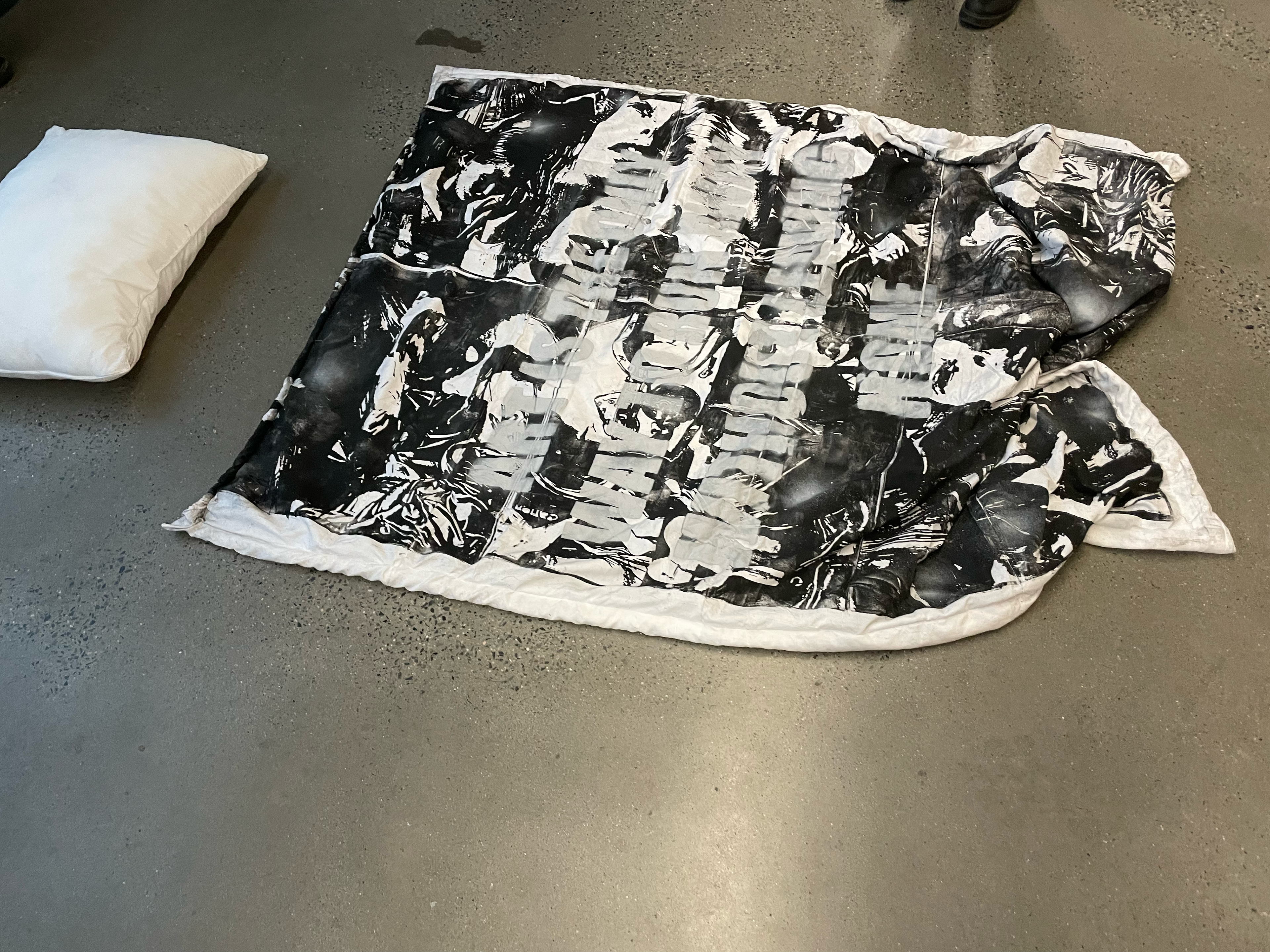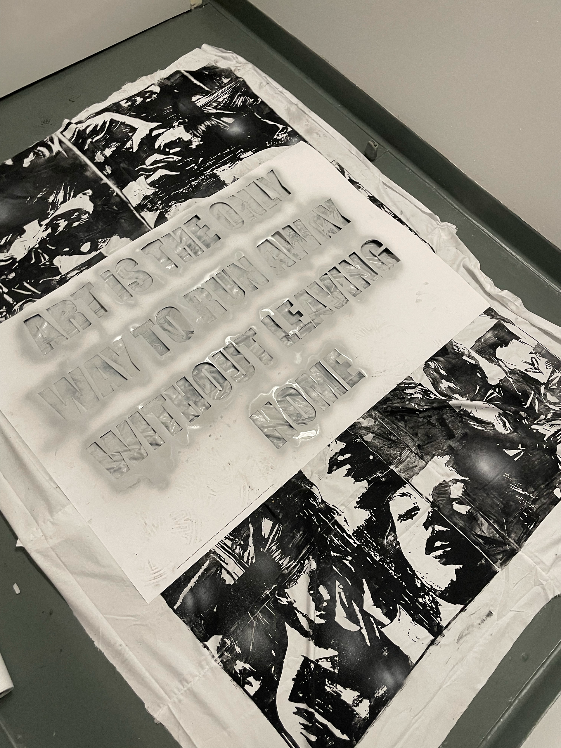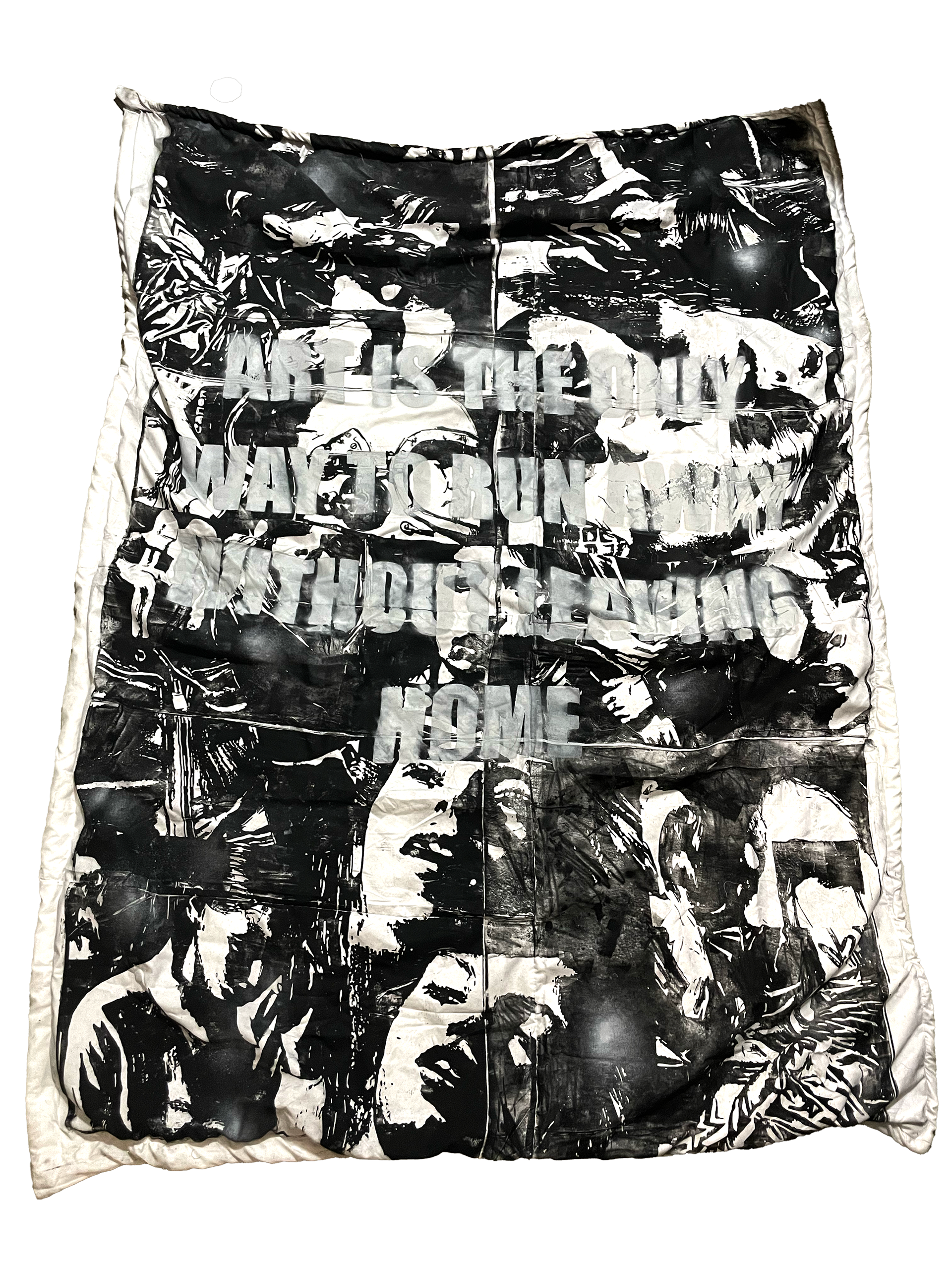 art is the only way to run away without leaving home (2022) This is a handmade object blanket that I both sewed and printed. I created four large 32 x 32 inch wooden stamps by laser-rastering my own drawings, a process that took eight hours per stamp. These stamps became the surface for layered prints, over which I added a sprayed stencil of the phrase “art is the only way to run away without leaving home.” The blanket embodies the act of escape through making. Hours of drawing, rastering, printing, and sewing became a space where I could step outside daily life. In the end, this object is not only something I can sleep under, but also a reminder of how art itself becomes a place of refuge.