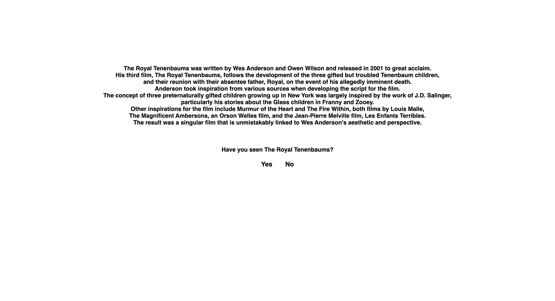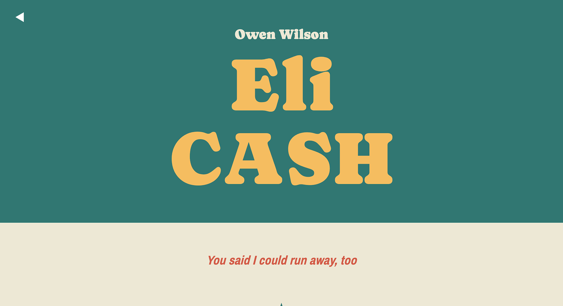 The Royal Tenenbaums website is an interactive project inspired by one of my favorite films. I love the humor of the story and the way the characters feel both like adults and children at the same time, which is something I relate to since I often imagine myself wanting to be strolled around by my mom. To highlight each character’s personality, I focused only on what they say throughout the movie. When you select a character’s name, it shows only their dialogue, which reveals their distinct voice. To make this even more vivid, I selected a unique typeface and color palette for each character, so their presence becomes visual even without showing their image. The conversations in the film are hilariously amazing, and I wanted that spirit to come through in the design.