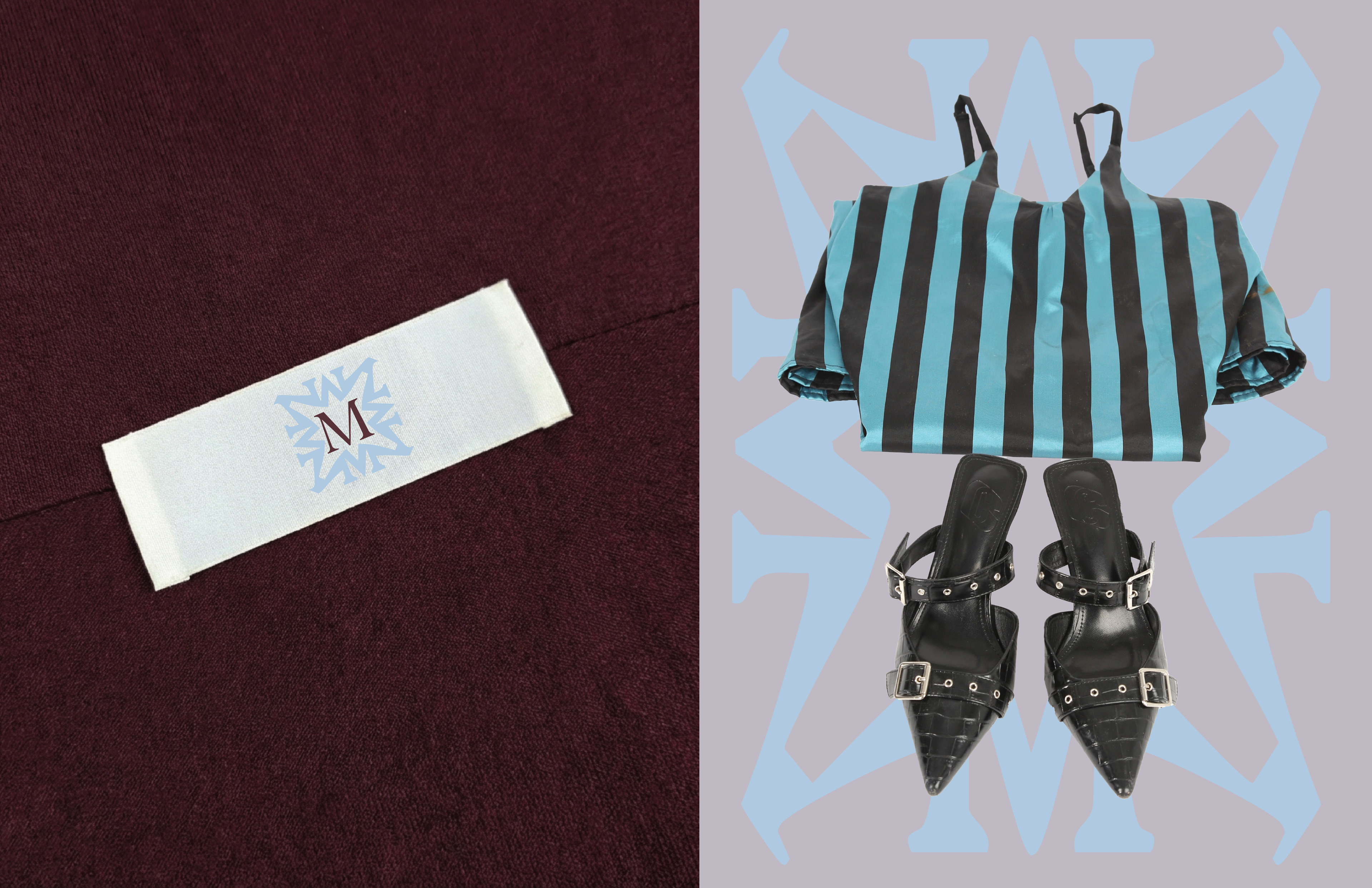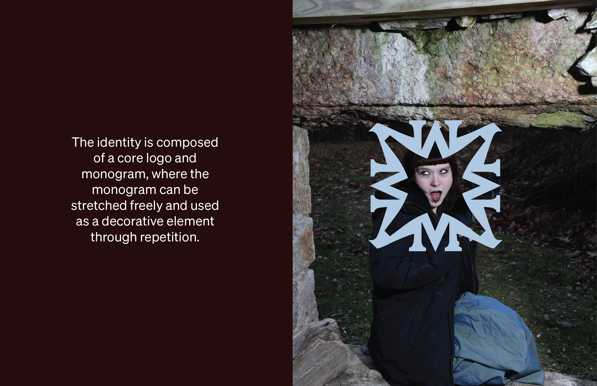 At the center of the system is a flexible logo and monogram pairing. The wordmark acts as a grounded core, while the monogram can be stretched, repeated, and layered as a decorative element across layouts. Used together, they allow the identity to shift between restraint and excess, appearing carved and stable in some contexts, then fractured, multiplied, or glitched in others. This modularity supports playfulness and variation across garments, motion, digital, and print applications.